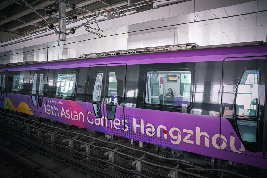 The photo taken on Sept. 5 shows a subway train adorned with the 19th Asian Games elements in Hangzhou, capital of east China's Zhejiang Province.