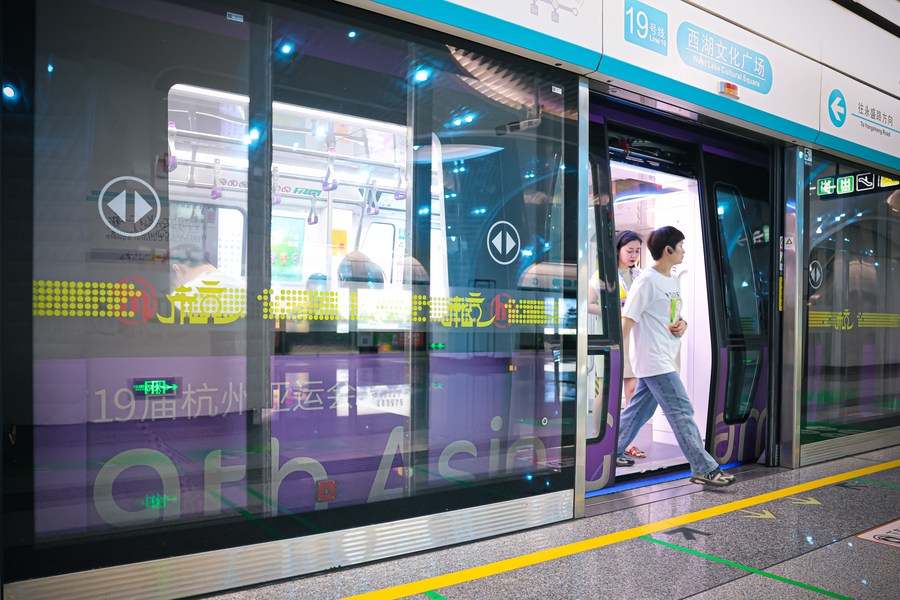 People walk out of a subway train adorned with the 19th Asian Games elements in Hangzhou, capital of east China's Zhejiang Province on Sept. 5, 2023.