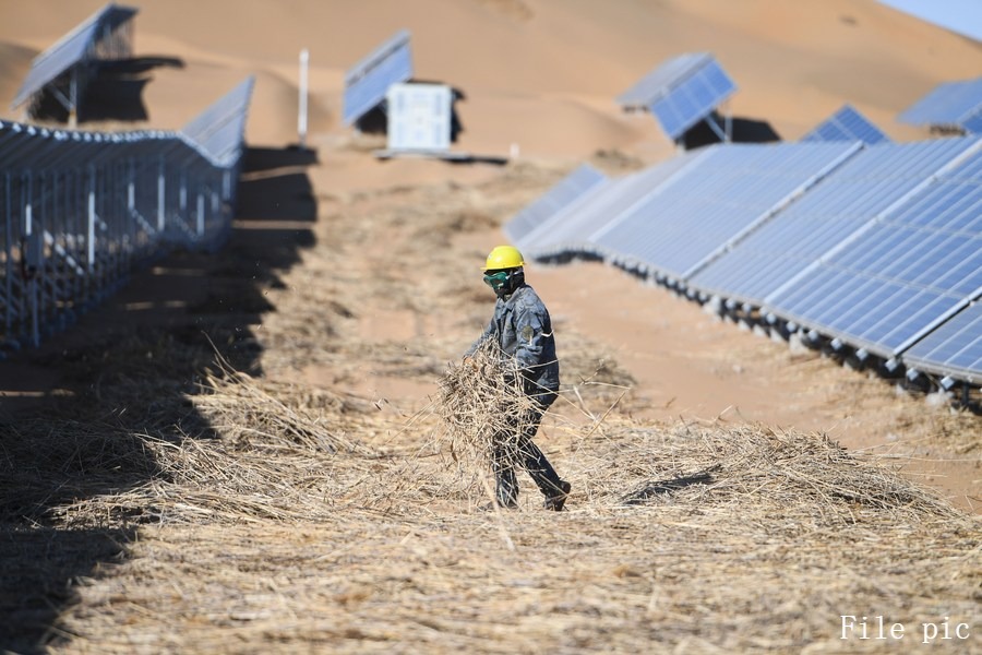 A worker paves sand barriers between photovoltaic panels to prevent and control desertification in Kubuqi Desert in north China's Inner Mongolia Autonomous Region, March 13, 2020. (Xinhua/Liu Lei)