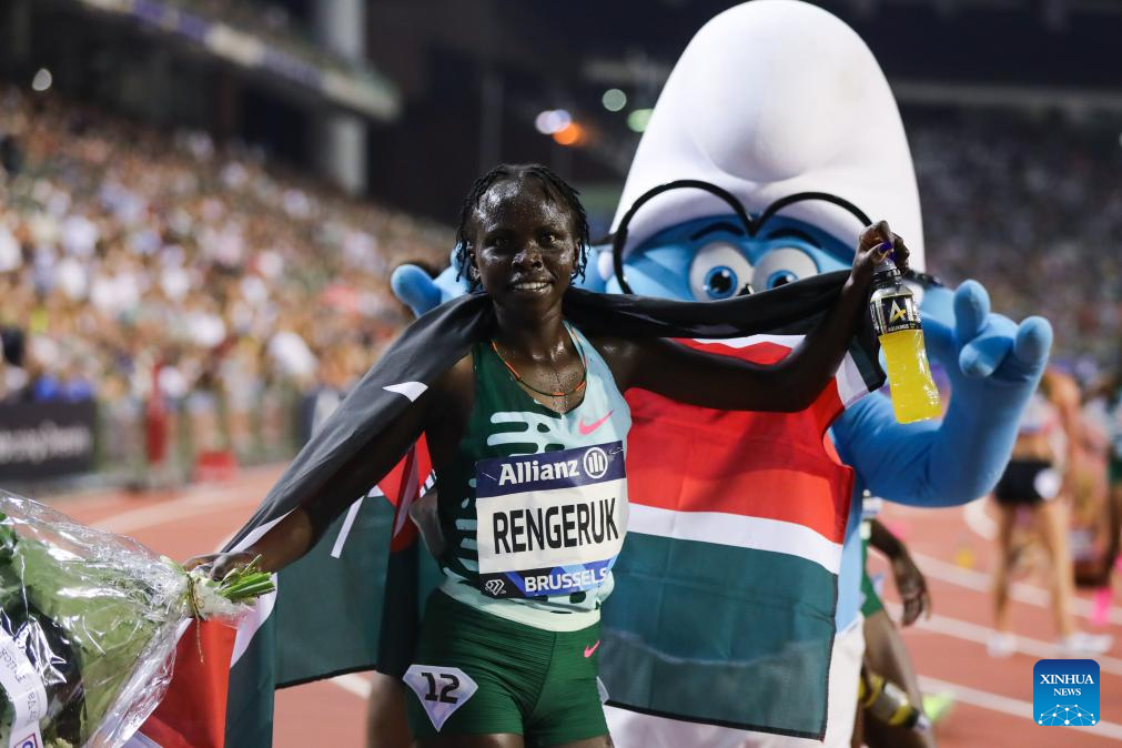 Lilian Kasait Rengeruk of Kenya reacts after the women's 5000m final at the 2023 Diamond League athletics meeting in Brussels, Belgium, Sept. 8, 2023. (Xinhua/Zheng Huansong)