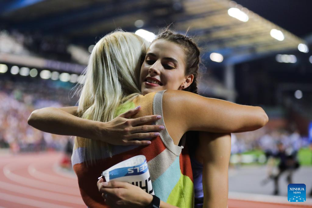 Yaroslava Mahuchikh (R) of Ukraine hugs her coach after the women's high jump final at the 2023 Diamond League athletics meeting in Brussels, Belgium, Sept. 8, 2023. (Xinhua/Zheng Huansong)