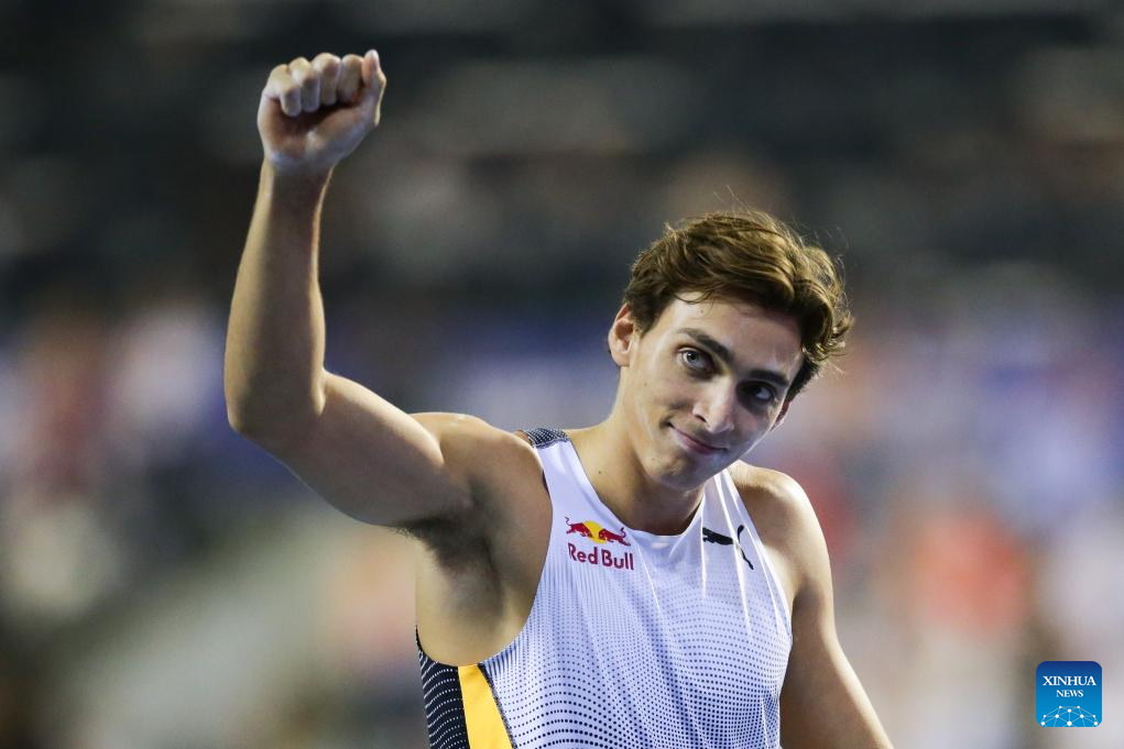 Armand Duplantis of Sweden reacts after the men's pole vault final at the 2023 Diamond League athletics meeting in Brussels, Belgium, Sept. 8, 2023. (Xinhua/Zheng Huansong)