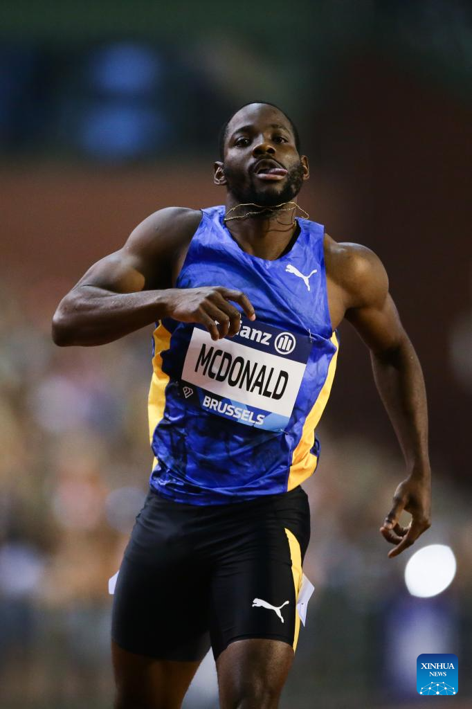 Rusheen Mcdonald of Jamaica reacts after the men's 400m final at the 2023 Diamond League athletics meeting in Brussels, Belgium, Sept. 8, 2023. (Xinhua/Zheng Huansong)