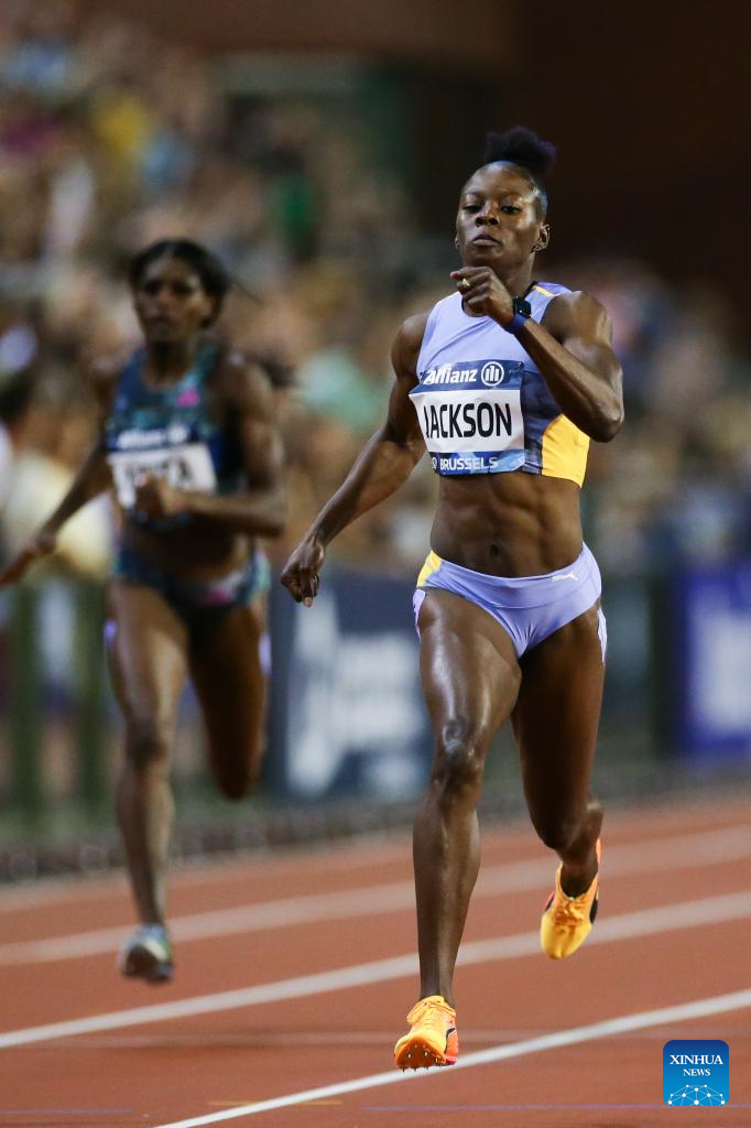 Shericka Jackson (R) of Jamaica competes during the women's 200m final at the 2023 Diamond League athletics meeting in Brussels, Belgium, Sept. 8, 2023. (Xinhua/Zheng Huansong)