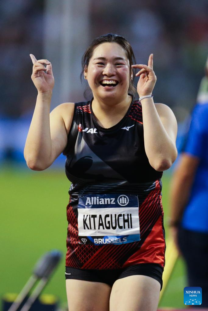 Japan's Kitaguchi Haruka celebrates after winning the women's javelin throw final at the 2023 Diamond League athletics meeting in Brussels, Belgium, Sept. 8, 2023. (Xinhua/Zheng Huansong)
