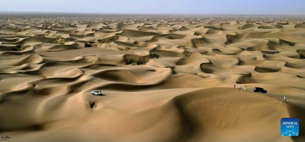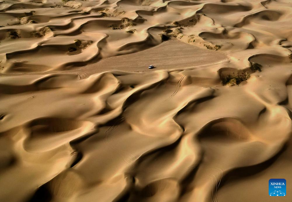 A car drives in a desert scenic spot in Makit County of Kashgar, northwest China's Xinjiang Uygur Autonomous Region, Sept. 7, 2023. Makit County, located on the southwestern rim of the Taklimakan Desert, has taken advantage of its natural resources to develop tourism and provide jobs for the local people. (Xinhua/Li An)