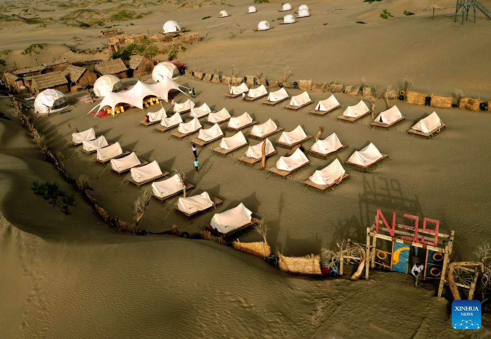 This aerial photo taken on Sept. 7, 2023 shows a campsite at a desert scenic spot in Makit County of Kashgar, northwest China's Xinjiang Uygur Autonomous Region. Makit County, located on the southwestern rim of the Taklimakan Desert, has taken advantage of its natural resources to develop tourism and provide jobs for the local people. (Xinhua/Li An)