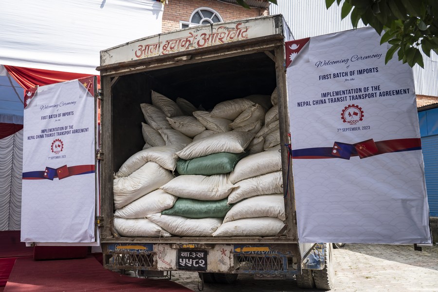 Nepal ships its first batch of imported goods under the transit arrangement with China to Kathmandu, Nepal, Sept. 7, 2023. (Photo by Hari Maharjan/Xinhua)