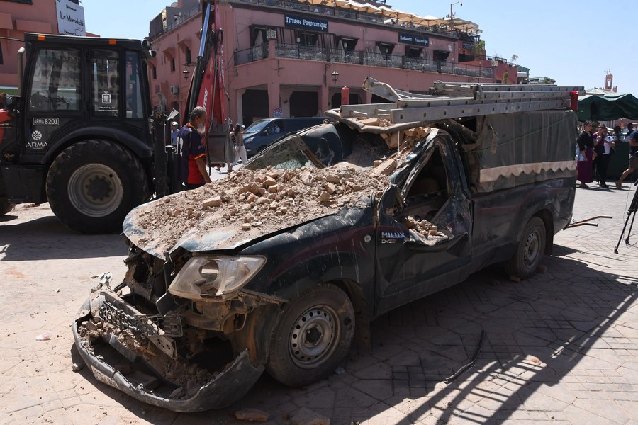 A damaged car is seen on Sept. 9, 2023 in Marrakesh, southern Morocco, after a 6.8-magnitude earthquake hit the kingdom on Sept. 8. (Photo by Saouri Aissa/Xinhua)