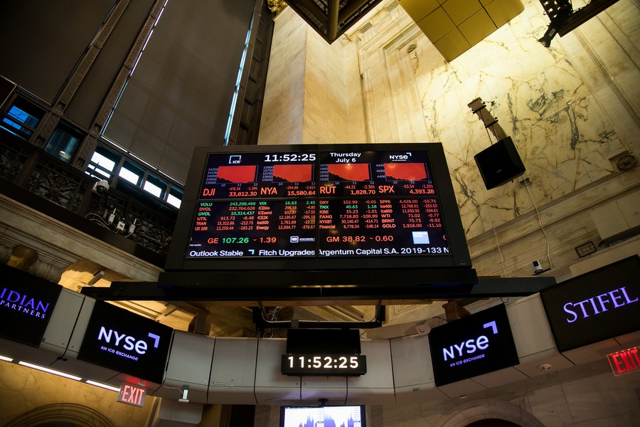 A screen displays stock market information at the New York Stock Exchange (NYSE) in New York, the United States, on July 6, 2023. (Photo by Michael Nagle/Xinhua)