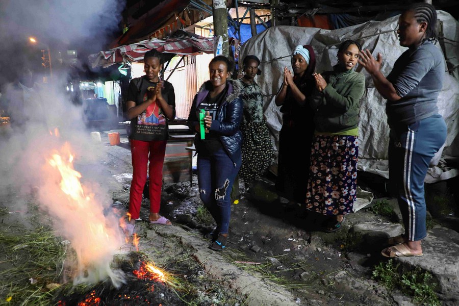 The file photo shows Ethiopian women celebrating around a bonfire on the eve of the Ethiopian New Year in Addis Ababa, capital of Ethiopia, on Sept. 10, 2020. (Xinhua/Michael Tewelde)