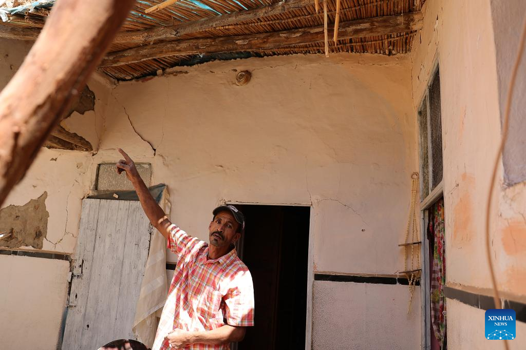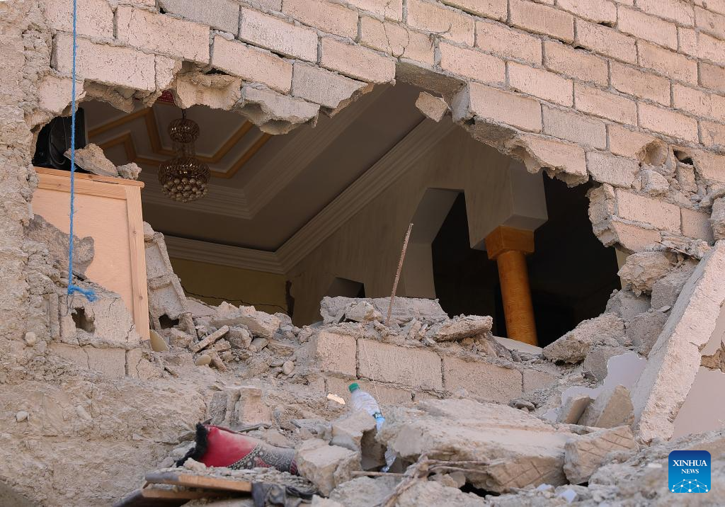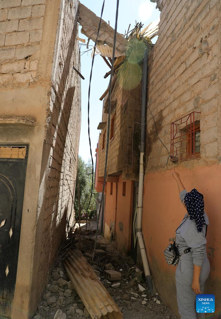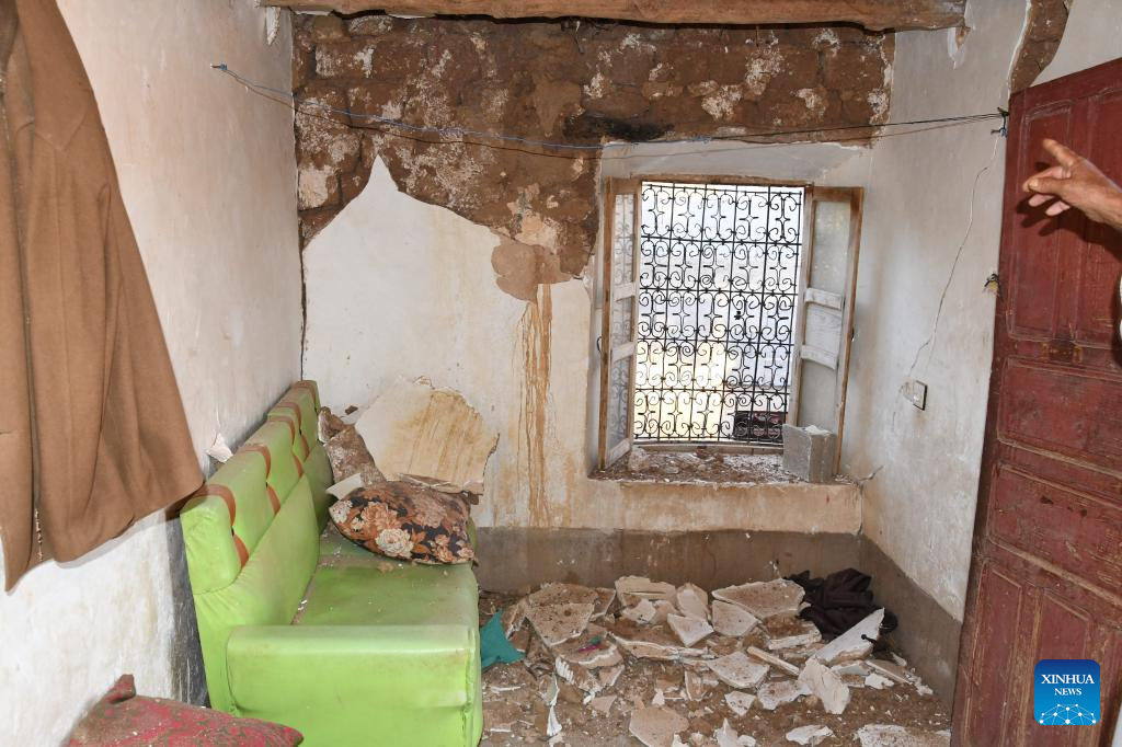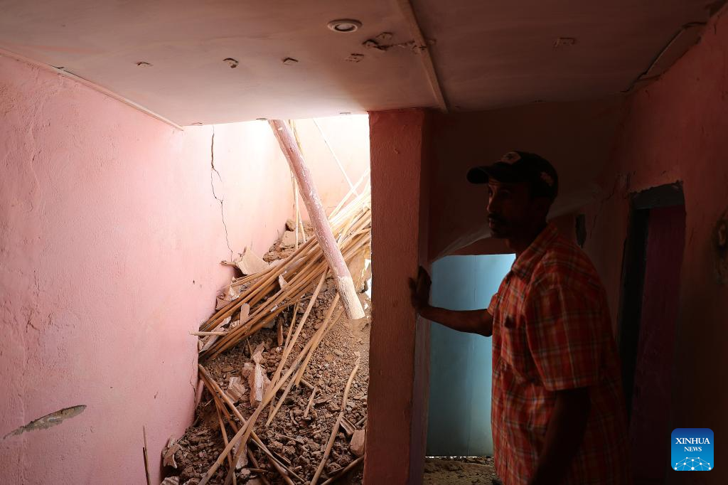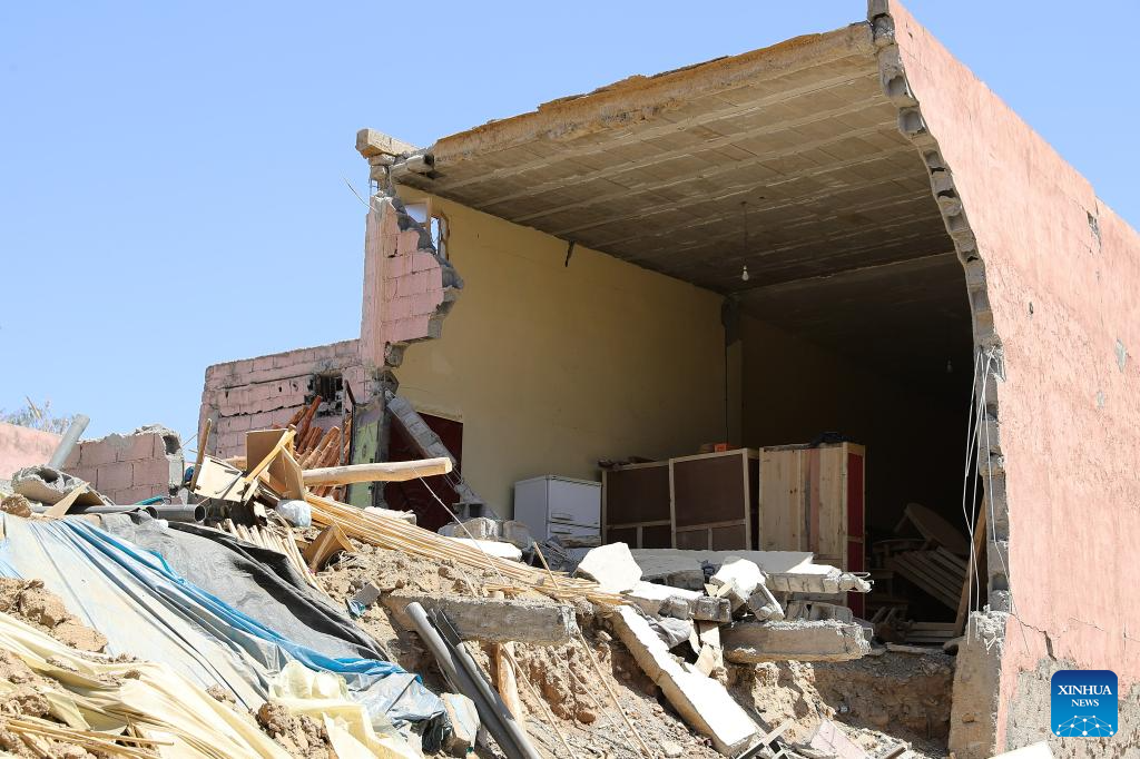 This photo taken on Sept. 9, 2023 shows a damaged house after a 6.8-magnitude earthquake in Tahannaout, Morocco. A 6.8-magnitude earthquake hit Morocco Friday at 11:11 p.m. local time (2211 GMT) at a depth of 18.5 km, said the United States Geological Survey. The epicenter of the earthquake was near the town of Ighil in Al Haouz Province, some 70 km southwest of Marrakesh.