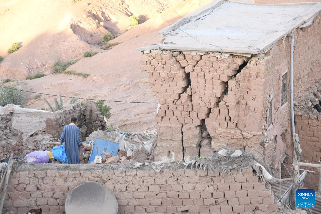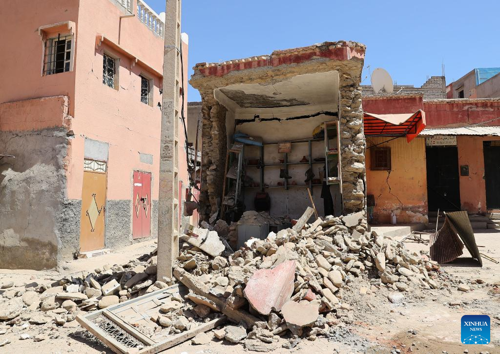 This photo shows a damaged building near the epicenter at Amizmiz Village in Morocco, Sept. 10, 2023. A 6.8-magnitude earthquake hit Morocco Friday. The epicenter of the earthquake was near the town of Ighil in Al Haouz Province, some 70 km southwest of Marrakesh.