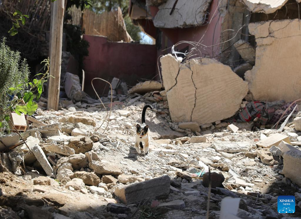 A cat walks along damaged buildings near the epicenter at Amizmiz Village in Morocco, Sept. 10, 2023. A 6.8-magnitude earthquake hit Morocco Friday. The epicenter of the earthquake was near the town of Ighil in Al Haouz Province, some 70 km southwest of Marrakesh.