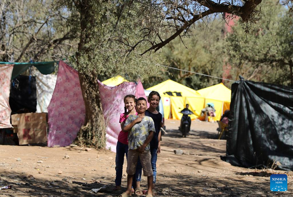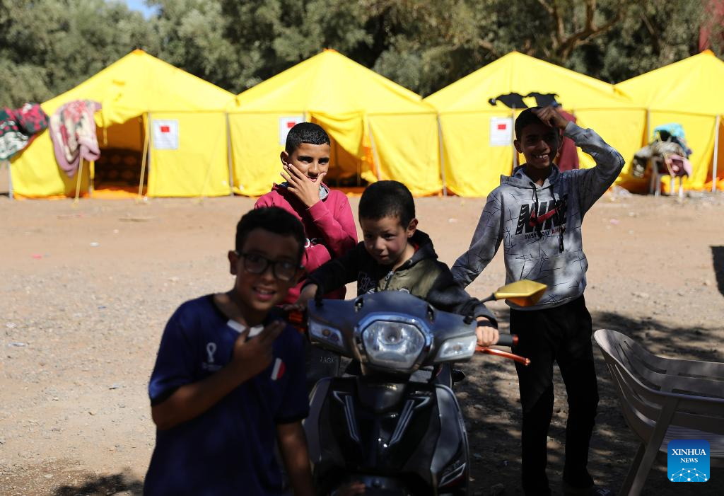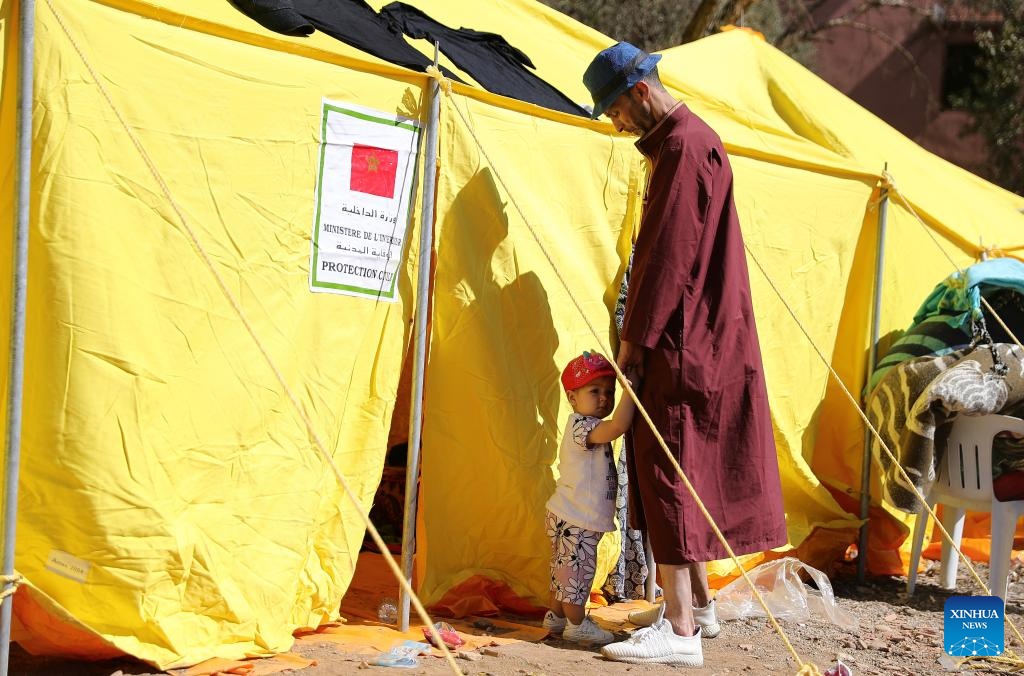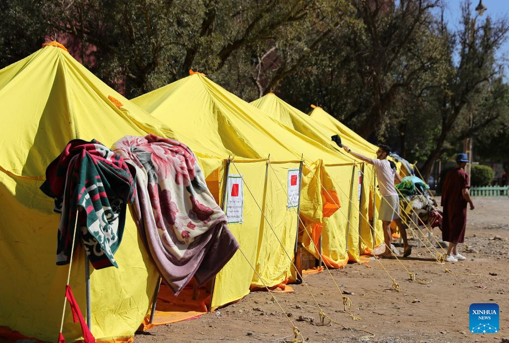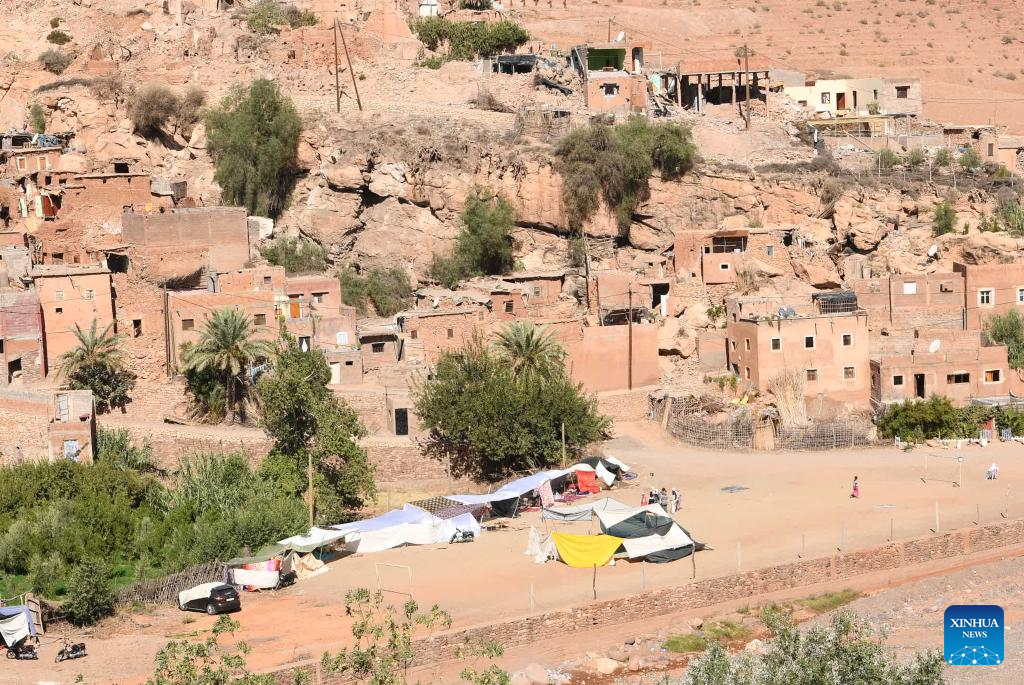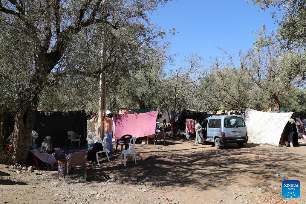 This photo shows a temporary shelter in an open space at Azrou Village near the epicenter in Morocco, Sept. 10, 2023. A 6.8-magnitude earthquake hit Morocco Friday. The epicenter of the earthquake was near the town of Ighil in Al Haouz Province, some 70 km southwest of Marrakesh.
