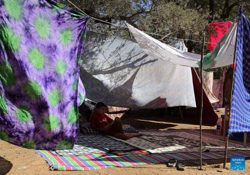 This photo shows a temporary shelter in an open space near the epicenter at Amizmiz Village in Morocco, Sept. 10, 2023. A 6.8-magnitude earthquake hit Morocco Friday. The epicenter of the earthquake was near the town of Ighil in Al Haouz Province, some 70 km southwest of Marrakesh.