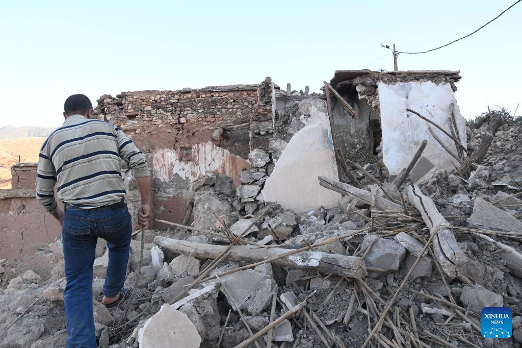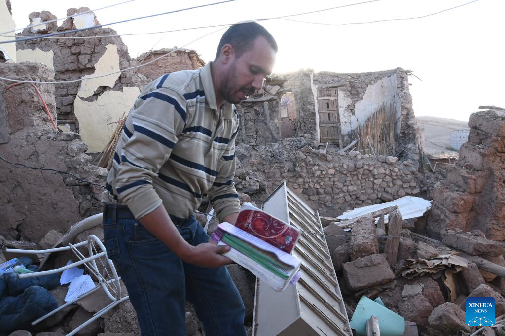A man searches for his belongings among the rubble of damaged buildings after a 6.8-magnitude earthquake in Tahannaout, Morocco,Sept. 9, 2023. A 6.8-magnitude earthquake hit Morocco Friday at 11:11 p.m. local time (2211 GMT) at a depth of 18.5 km, said the United States Geological Survey. The epicenter of the earthquake was near the town of Ighil in Al Haouz Province, some 70 km southwest of Marrakesh.
