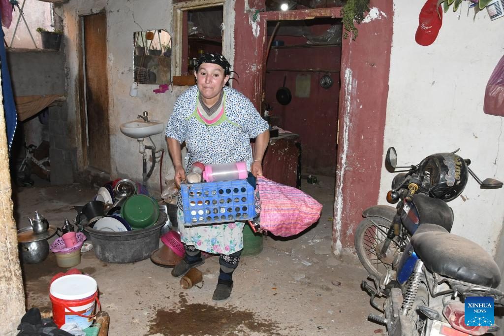 A woman cleans her damaged house after a 6.8-magnitude earthquake in Tahannaout, Morocco, Sept. 9, 2023. A 6.8-magnitude earthquake hit Morocco Friday at 11:11 p.m. local time (2211 GMT) at a depth of 18.5 km, said the United States Geological Survey. The epicenter of the earthquake was near the town of Ighil in Al Haouz Province, some 70 km southwest of Marrakesh.