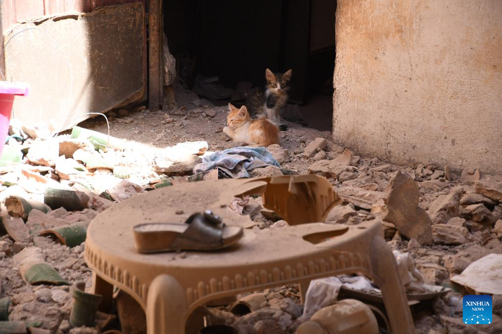 Cats are seen at a damaged building after a 6.8-magnitude earthquake in Marrakesh, Morocco, Sept. 9, 2023. The death toll from a strong earthquake that struck Morocco Friday night has risen to 1,037, said the country's Interior Ministry on Saturday.