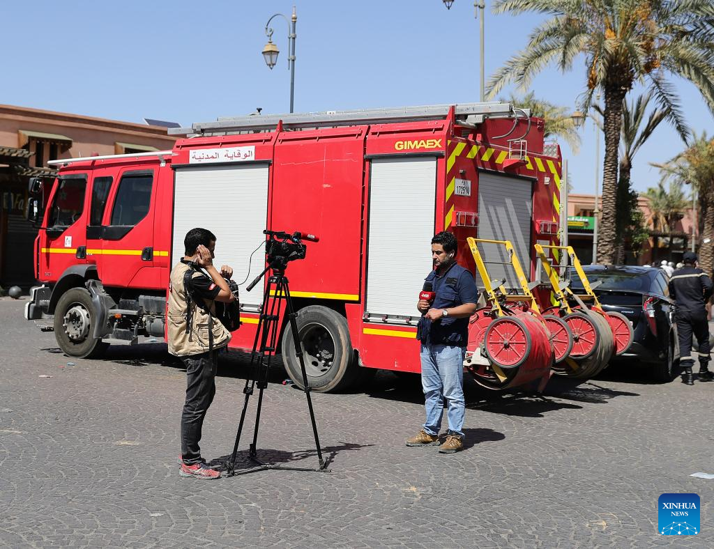 Reporters work after a 6.8-magnitude earthquake in Marrakesh, Morocco, Sept. 9, 2023. The death toll from a strong earthquake that struck Morocco Friday night has risen to 1,037, said the country's Interior Ministry on Saturday.