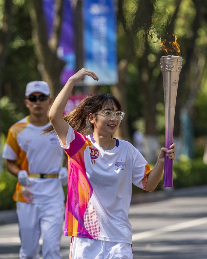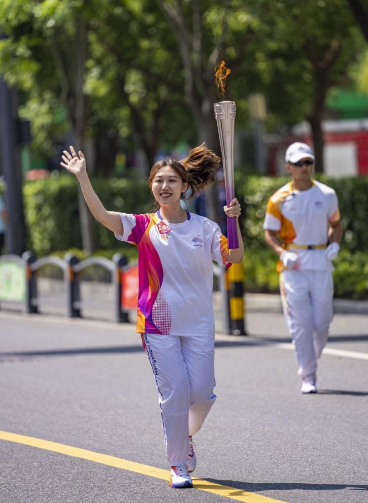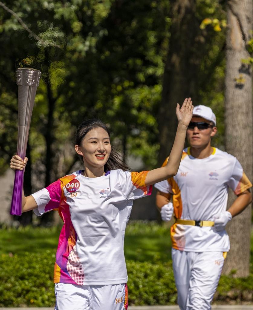 Torch bearer Wang Jingxuan runs with the torch during the torch relay of the 19th Asian Games in Jiaxing, east China's Zhejiang Province, Sept. 10, 2023. (Xinhua/Sun Fei)