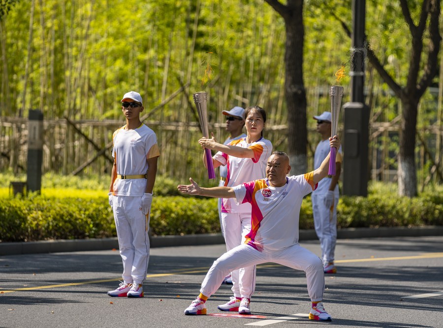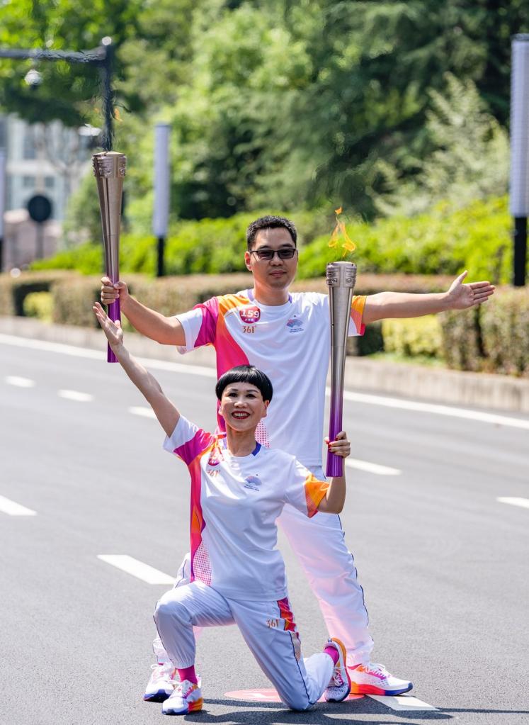 Torch bearers Xu Bingwu (top) and Wang Weijia pose during the torch relay of the 19th Asian Games in Jiaxing, east China's Zhejiang Province, Sept. 10, 2023. (Xinhua/Sun Fei)