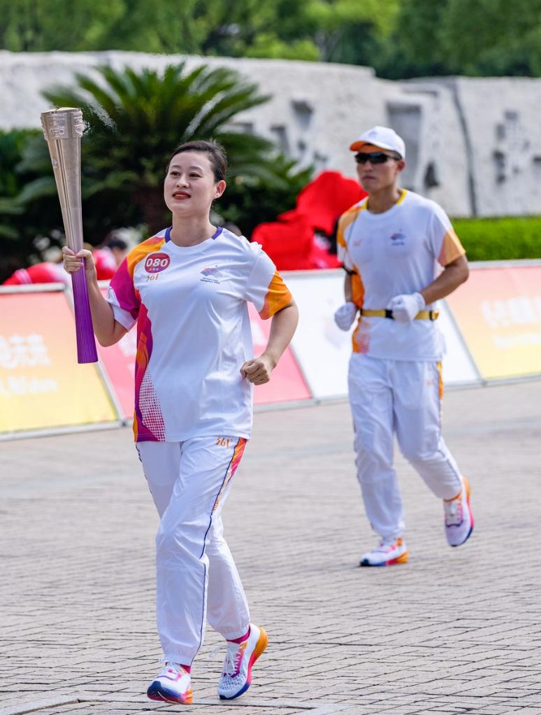 Torch bearer Yuan Jing runs with the torch during the torch relay of the 19th Asian Games in Jiaxing, east China's Zhejiang Province, Sept. 10, 2023. (Xinhua/Sun Fei)