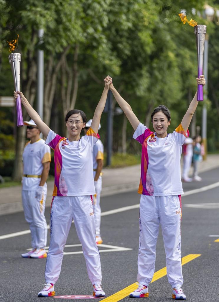 Torch bearers Hu Tingting (L) and Sun Xiaoyun pose during the torch relay of the 19th Asian Games in Jiaxing, east China's Zhejiang Province, Sept. 10, 2023. (Xinhua/Sun Fei)