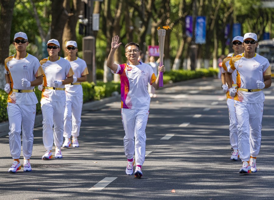 Torch bearer Zheng Wenshan runs with the torch during the torch relay of the 19th Asian Games in Jiaxing, east China's Zhejiang Province, Sept. 10, 2023. (Xinhua/Sun Fei)