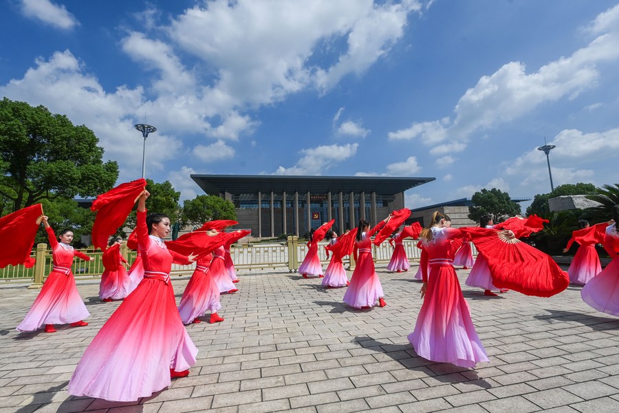 Actors and actresses perform before the torch relay of the 19th Asian Games in Jiaxing, east China's Zhejiang Province, Sept. 10, 2023. (Xinhua/Sun Fei)