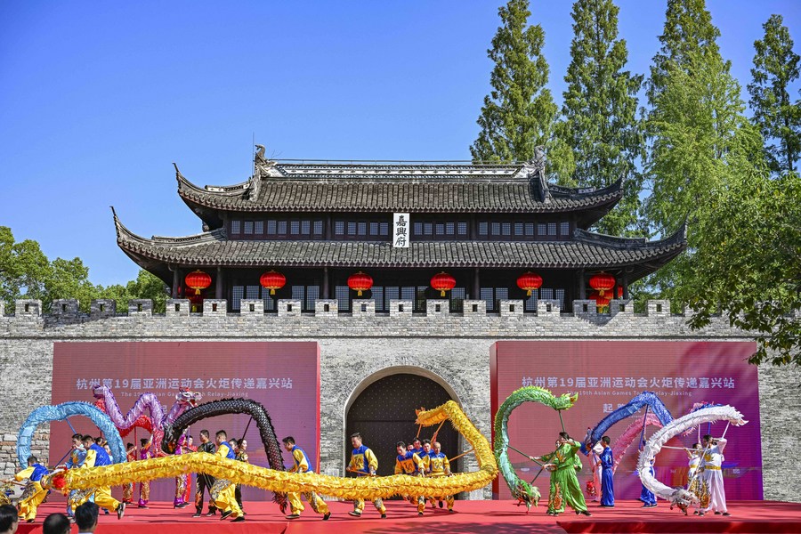 Dancers perform during the torch relay of the 19th Asian Games in Jiaxing, east China's Zhejiang Province, Sept. 10, 2023. (Xinhua/Xu Yu)