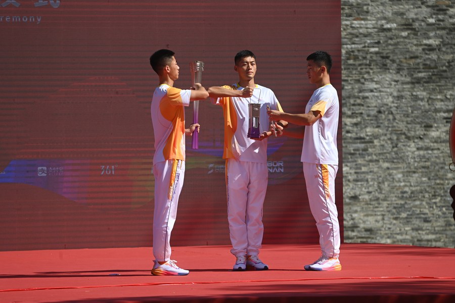 Staff members display the flame before the torch relay of the 19th Asian Games in Jiaxing, east China's Zhejiang Province, Sept. 10, 2023. (Xinhua/Xu Yu)