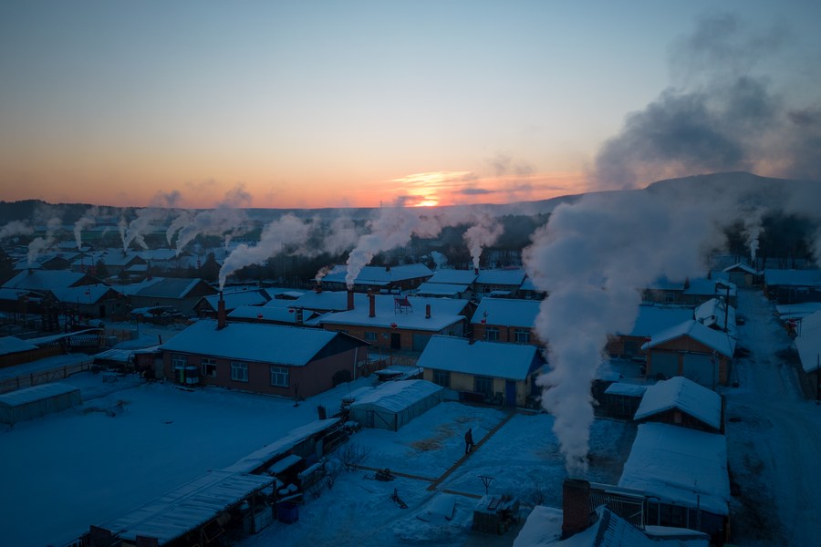 This aerial photo taken on Jan. 8, 2023 shows an early morning view of Beiji Village in Mohe, northeast China's Heilongjiang Province. (Xinhua/Zhang Tao)
