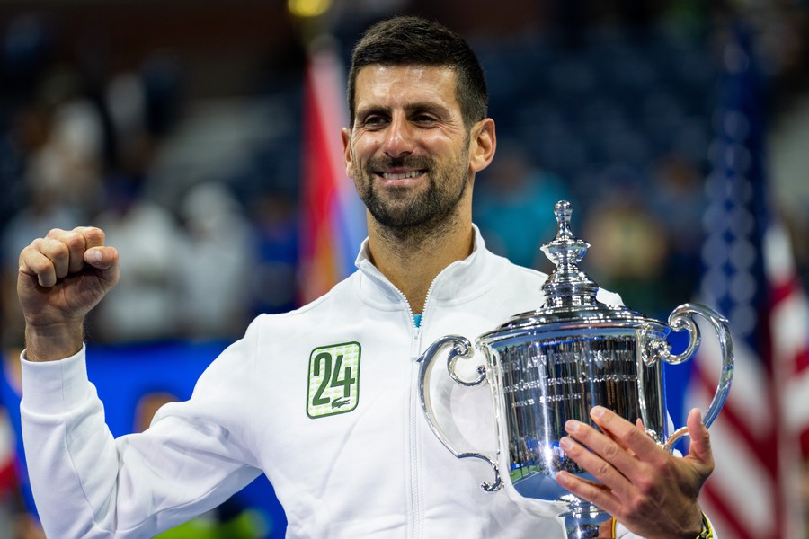 Novak Djokovic of Serbia celebrates during the awarding ceremony for the men's singles at the 2023 US Open tennis championships in New York, on Sept. 10, 2023. (Xinhua/Liu Jie)