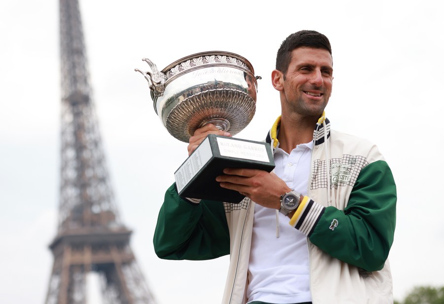 Novak Djokovic of Serbia poses with the Musketeers' Trophy during a photocall a day after winning the men's singles at the French Open tennis tournament in Paris, June 12, 2023. (Xinhua/Gao Jing)