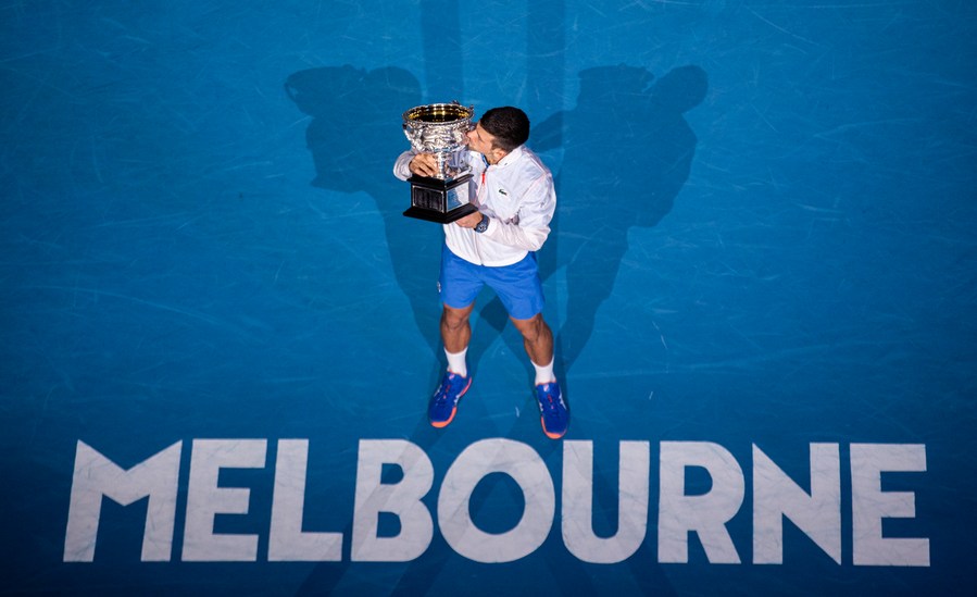 Novak Djokovic of Serbia kisses his trophy during the awarding ceremony after the men's singles final against Stefanos Tsitsipas of Greece at Australian Open tennis tournament, in Melbourne, Jan. 29, 2023. (Photo by Hu Jingchen/Xinhua)