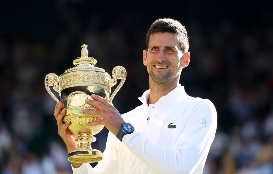 Novak Djokovic celebrates with trophy after winning the men's singles final against Nick Kyrgios of Australia at Wimbledon Tennis Championship in London, on July 10, 2022. (Xinhua/Li Ying)