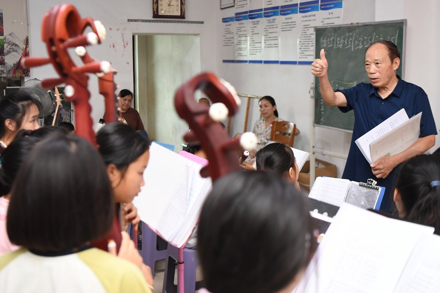 Li Shuyou teaches students music at Shuyou Music Workshop in Jiantouzhou Village of Liling City, central China's Hunan Province, Aug. 12, 2023. (Xinhua/Xue Yuge)