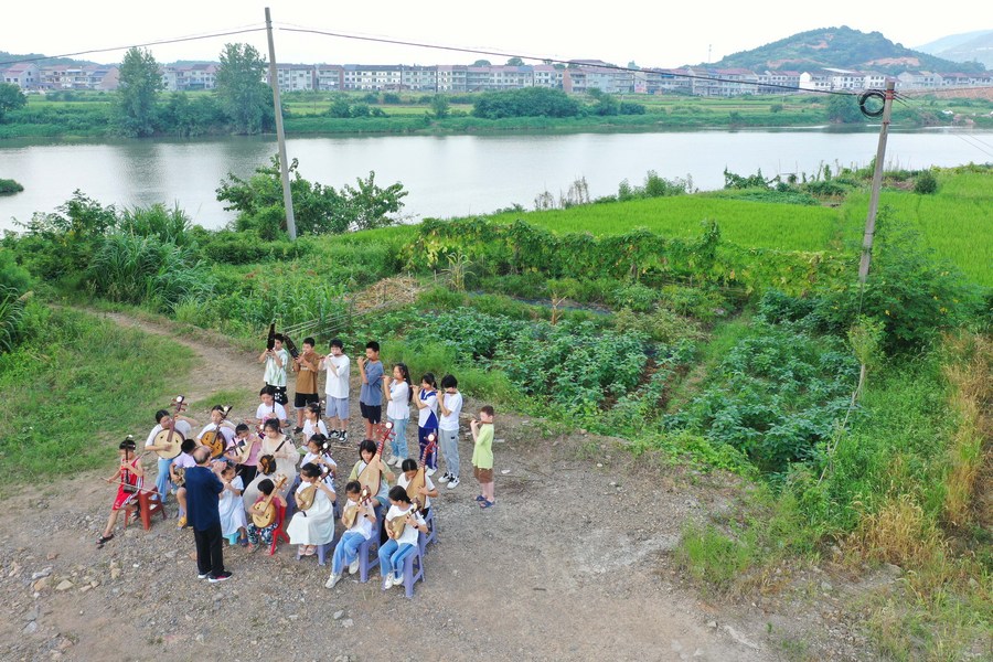 This aerial photo taken on Aug. 12, 2023 shows Li Shuyou and students performing an open air ensemble in Jiantouzhou Village of Liling City, central China's Hunan Province. (Xinhua/Xue Yuge)