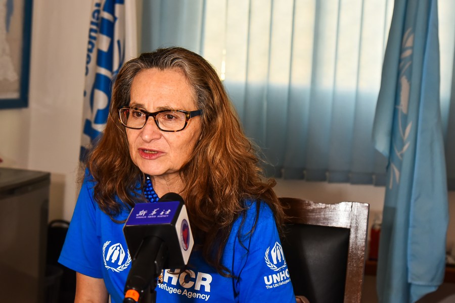 Kimberly Roberson, head of the United Nations High Commissioner for Refugees (UNHCR) Sub-office in Maroua, answers questions from Xinhua at her office in Maroua, Far North region, Cameroon, Aug. 8, 2023. (Xinhua/Kepseu)