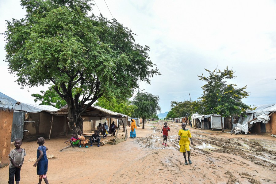 This photo shows tree-lined streets with children playing at the refugee camp in Minawao, Far North region, Cameroon, Aug. 6, 2023. (Xinhua/Kepseu)