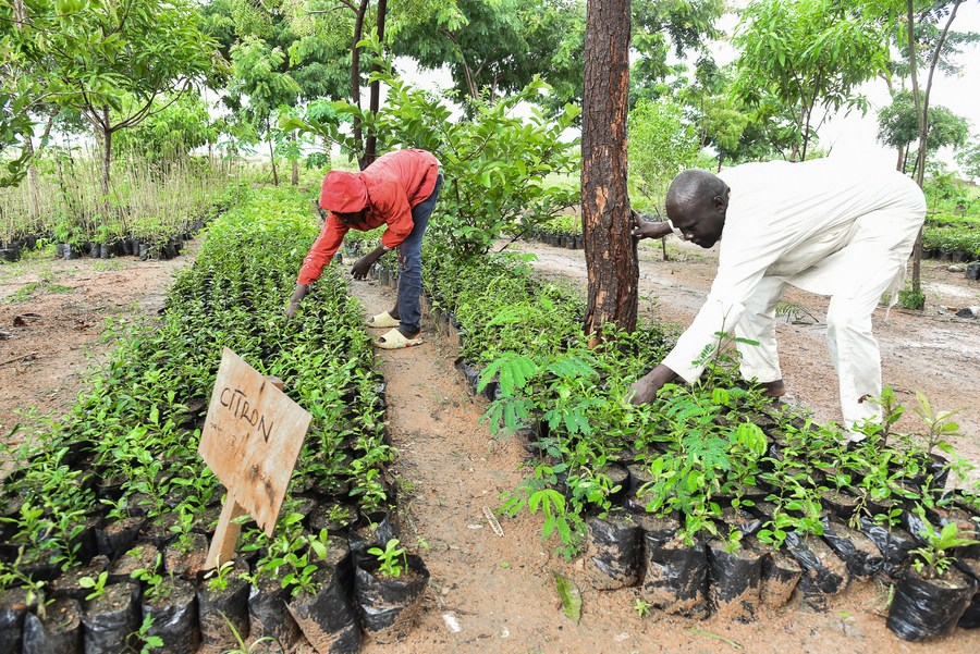 Refugees work in the tree nursery at the camp in Minawao, Far North region, Cameroon, Aug. 6, 2023. (Xinhua/Kepseu)