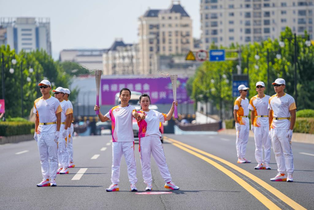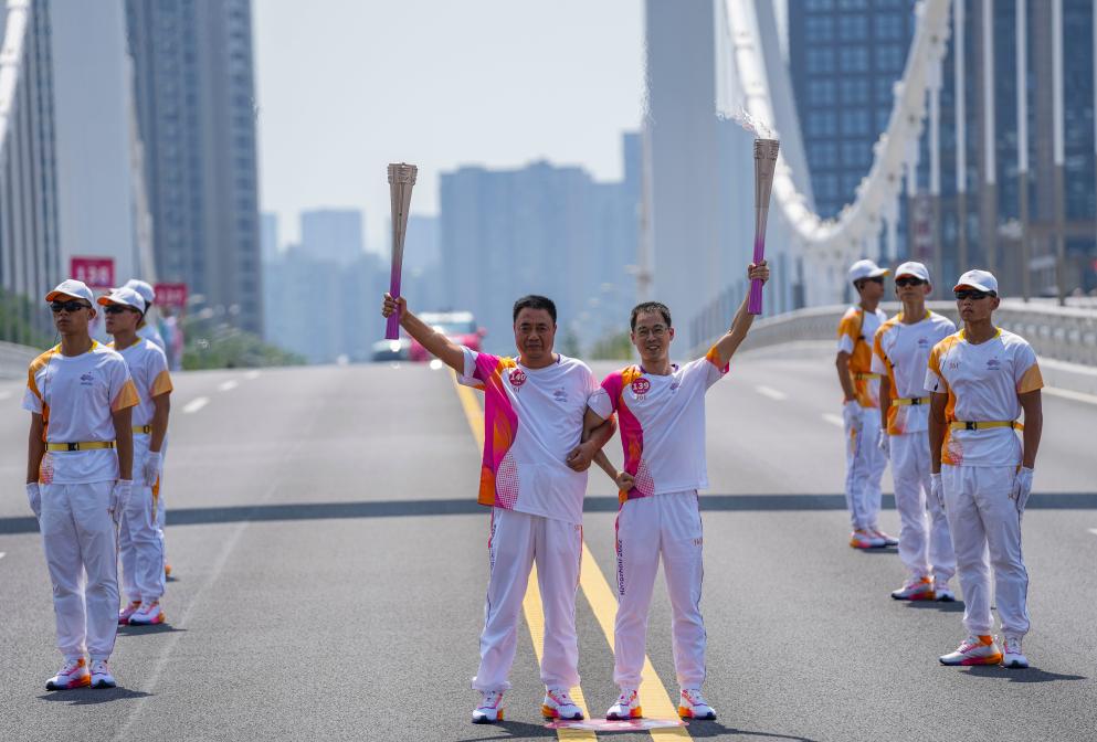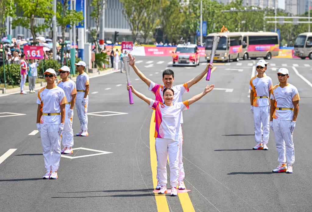 Torch bearers Shan Jie (L) and Zhang Di pose during the torch relay of the 19th Asian Games in Shaoxing, east China's Zhejiang Province, Sept. 11, 2023. (Xinhua/Sun Fei)