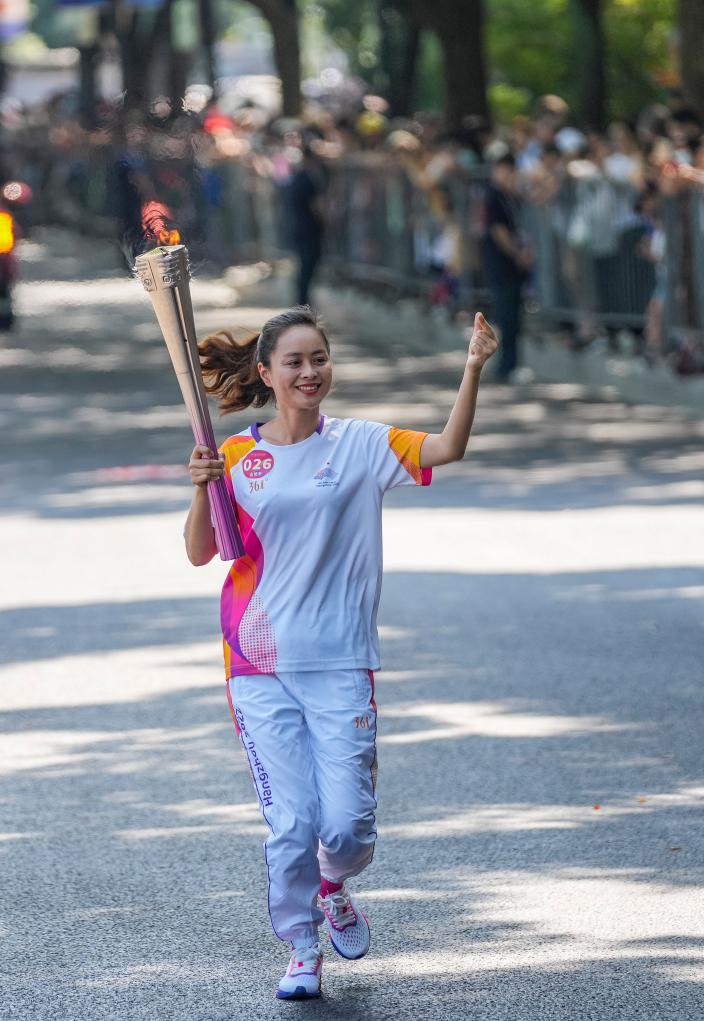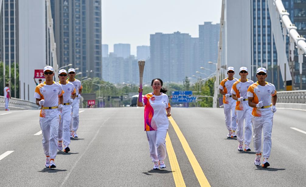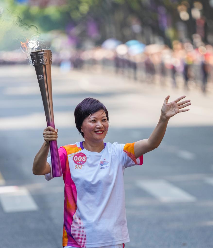 Torch bearer Lin Qiong runs with the torch during the torch relay of the 19th Asian Games in Shaoxing, east China's Zhejiang Province, Sept. 11, 2023. (Xinhua/Sun Fei)