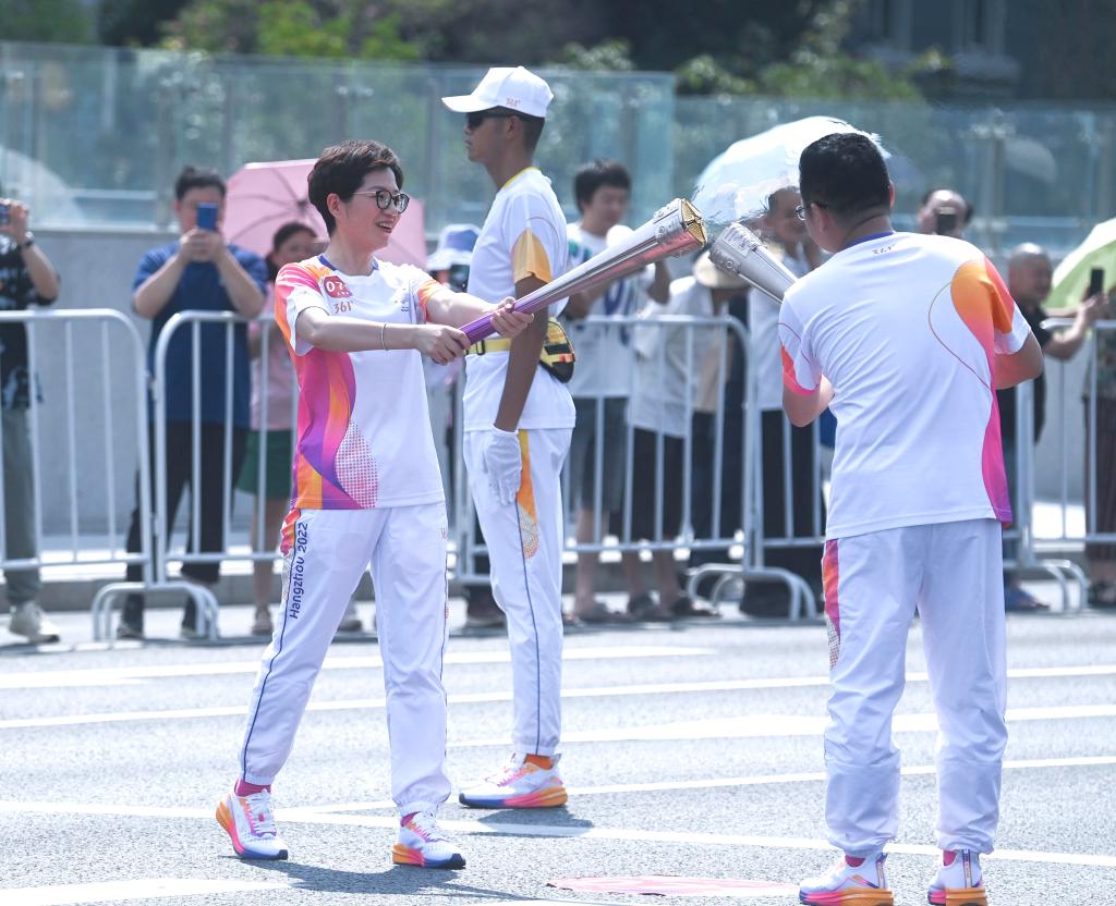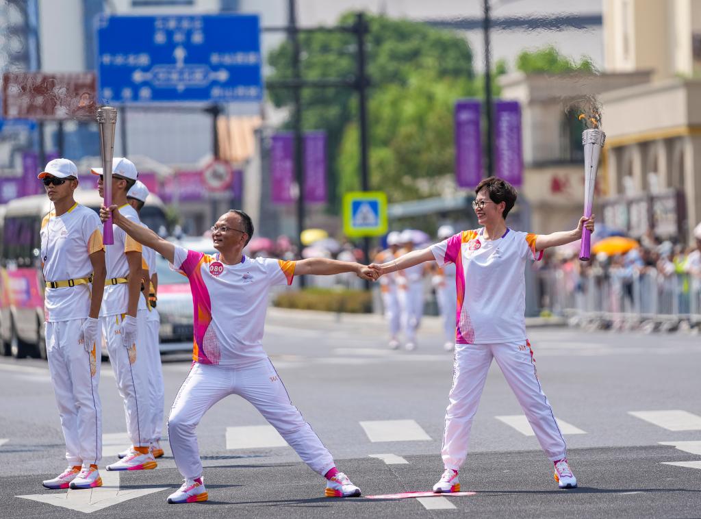 Torch bearers Liu Zhonghua (Top) and Chu Miaoyin pose during the torch relay of the 19th Asian Games in Shaoxing, east China's Zhejiang Province, Sept. 11, 2023. (Xinhua/Sun Fei)