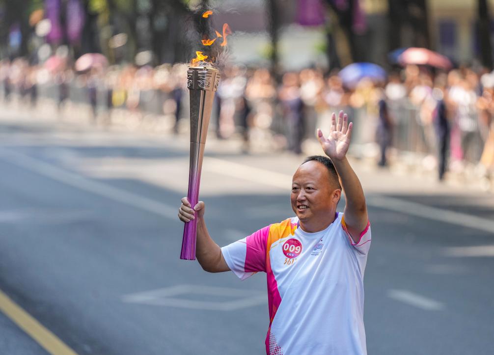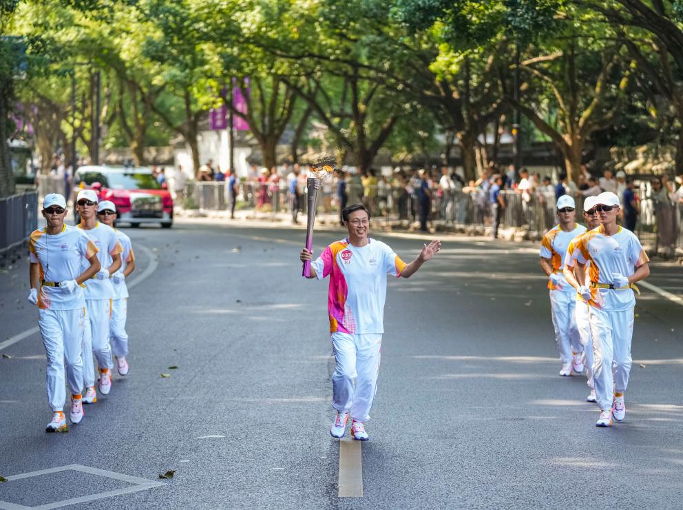 Torch bearer Xia Zhigang runs with the torch during the torch relay of the 19th Asian Games in Shaoxing, east China's Zhejiang Province, Sept. 11, 2023. (Xinhua/Sun Fei)