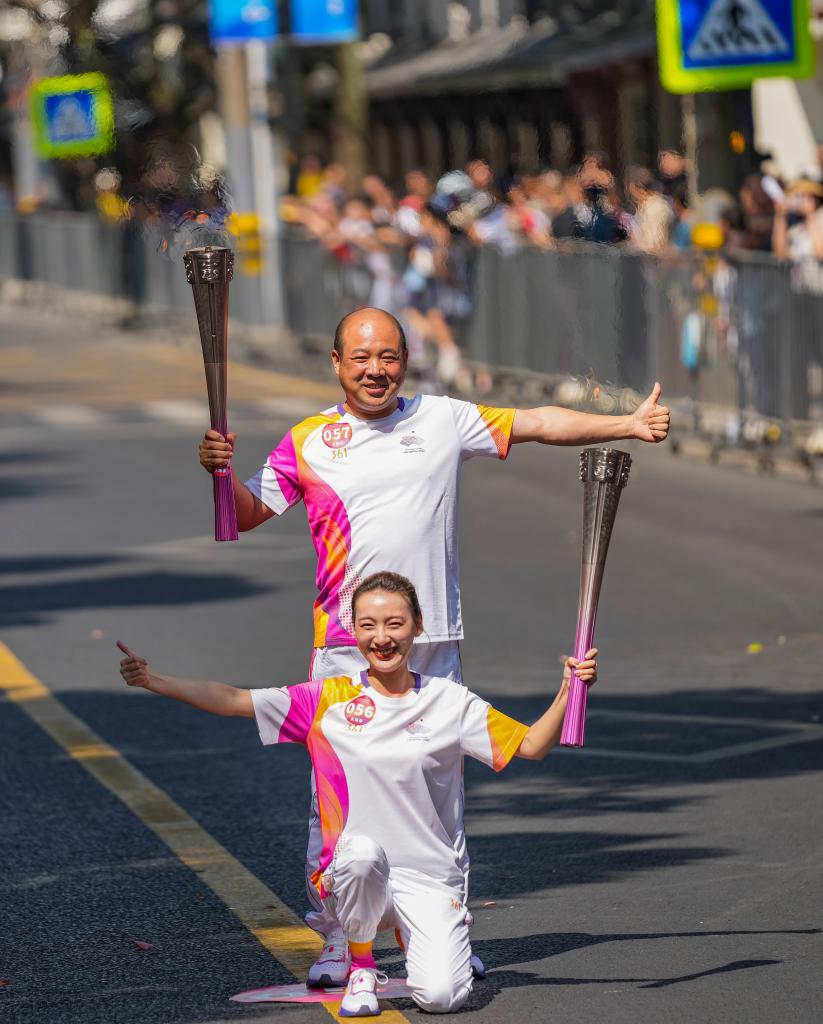 Torch bearers Lu Jiangfeng (Top) and Chen Weiling pose during the torch relay of the 19th Asian Games in Shaoxing, east China's Zhejiang Province, Sept. 11, 2023. (Xinhua/Sun Fei)