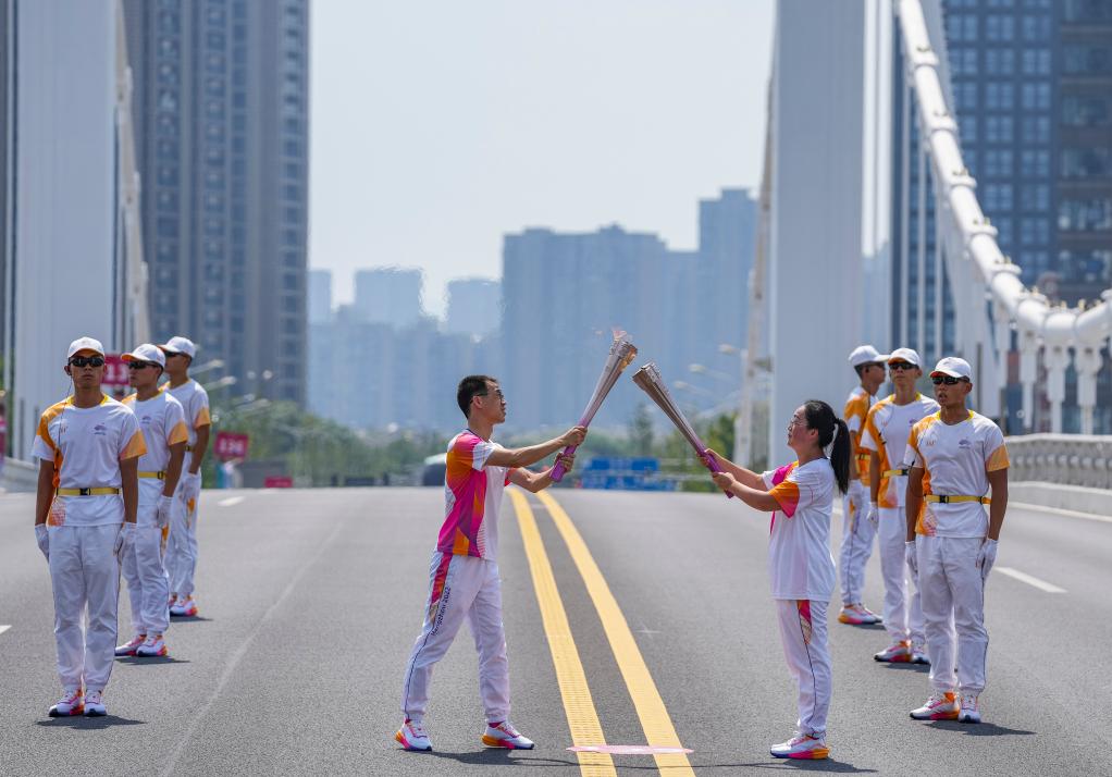 Torch bearers Li Chengjie (L) and Dong Sijiao pass the flame during the torch relay of the 19th Asian Games in Shaoxing, east China's Zhejiang Province, Sept. 11, 2023. (Xinhua/Sun Fei)