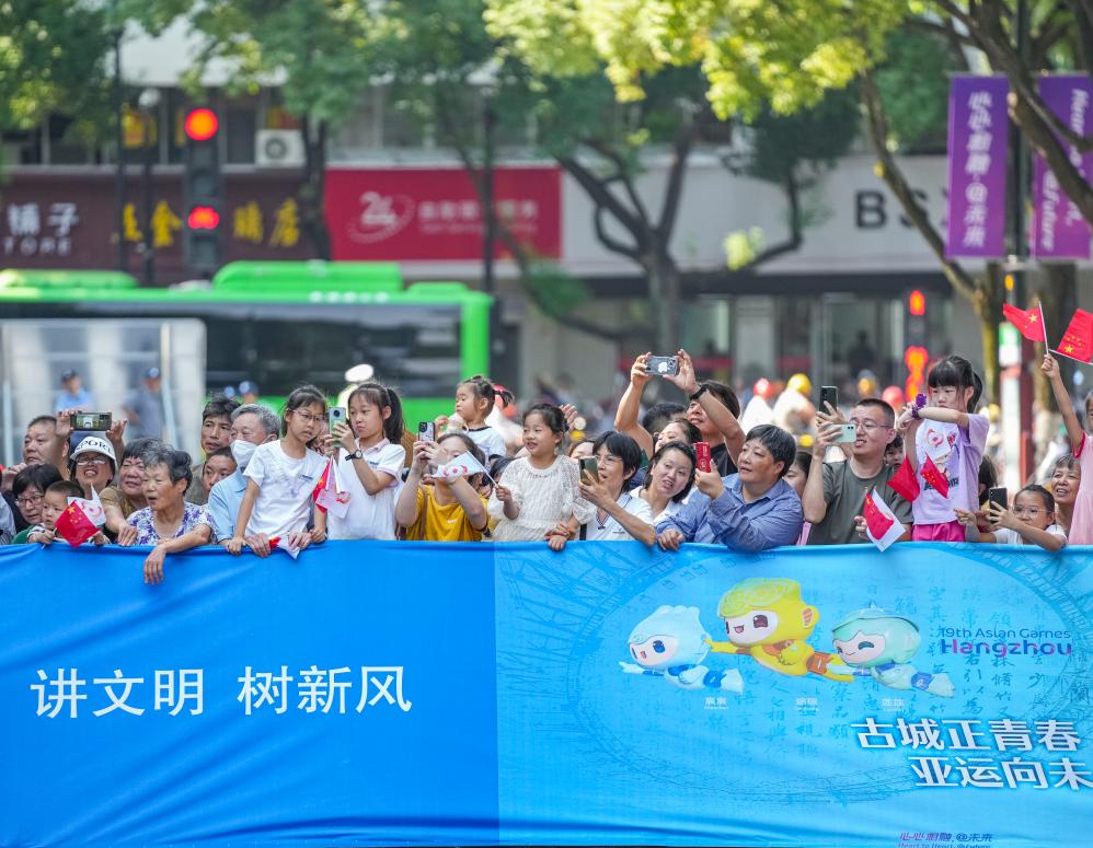 People watch the torch relay of the 19th Asian Games in Shaoxing, east China's Zhejiang Province, Sept. 11, 2023. (Xinhua/Sun Fei)