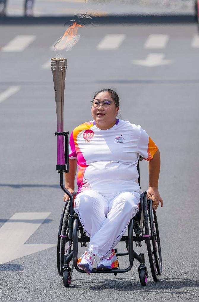 Torch bearer Ying Meiling runs with the torch during the torch relay of the 19th Asian Games in Shaoxing, east China's Zhejiang Province, Sept. 11, 2023. (Xinhua/Sun Fei)